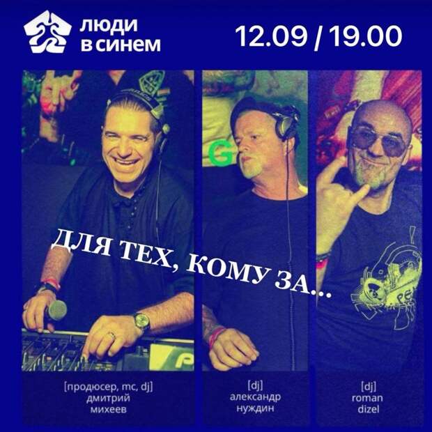 12 сентября в 19:00 в заведении Люди в Синем пройдет вечеринка «Для тех кому за…» с музыкой 90-х и 2000-х годов. На ней выступят диджеи Александр Нуждин, Дмитрий Михеев и Roman Dizel.
